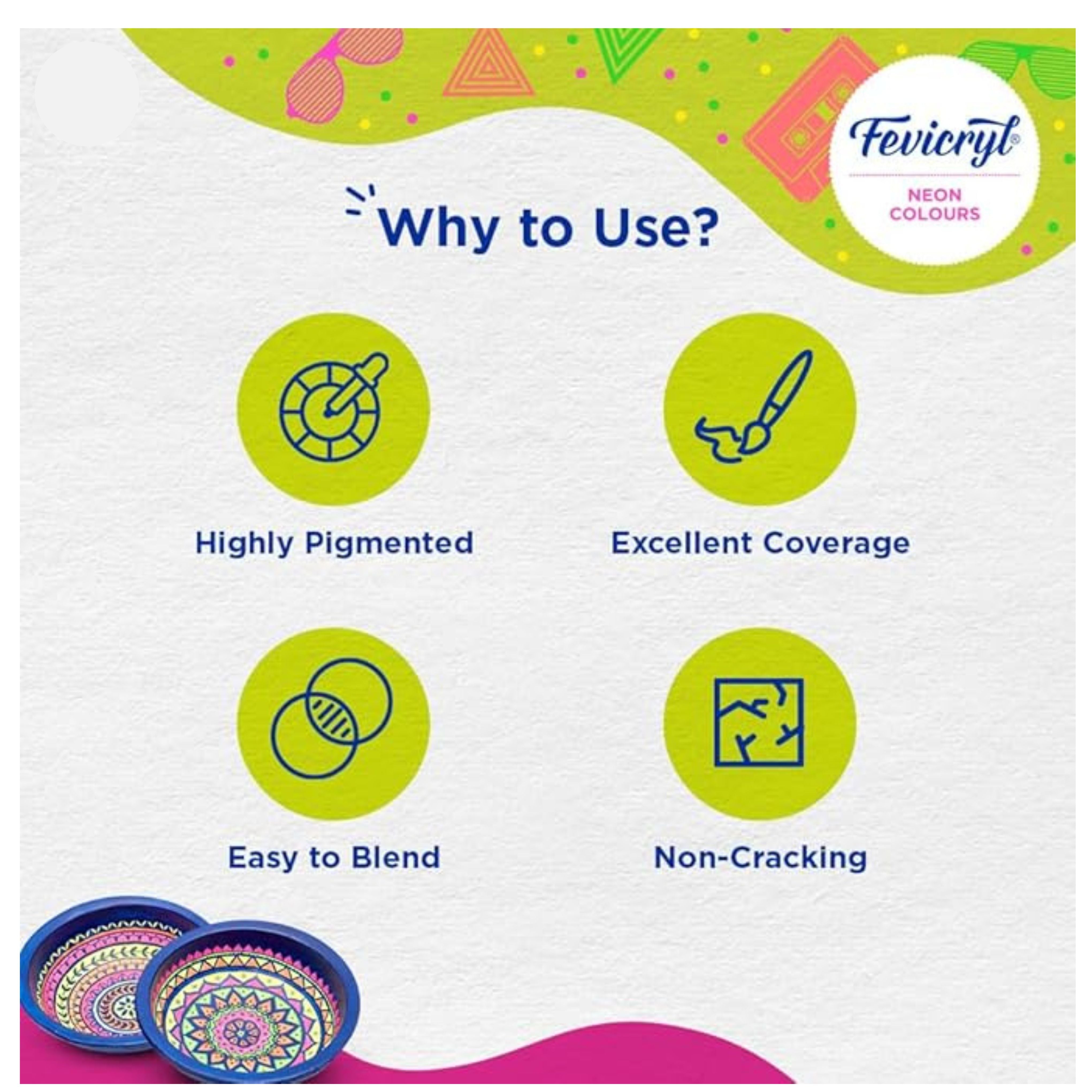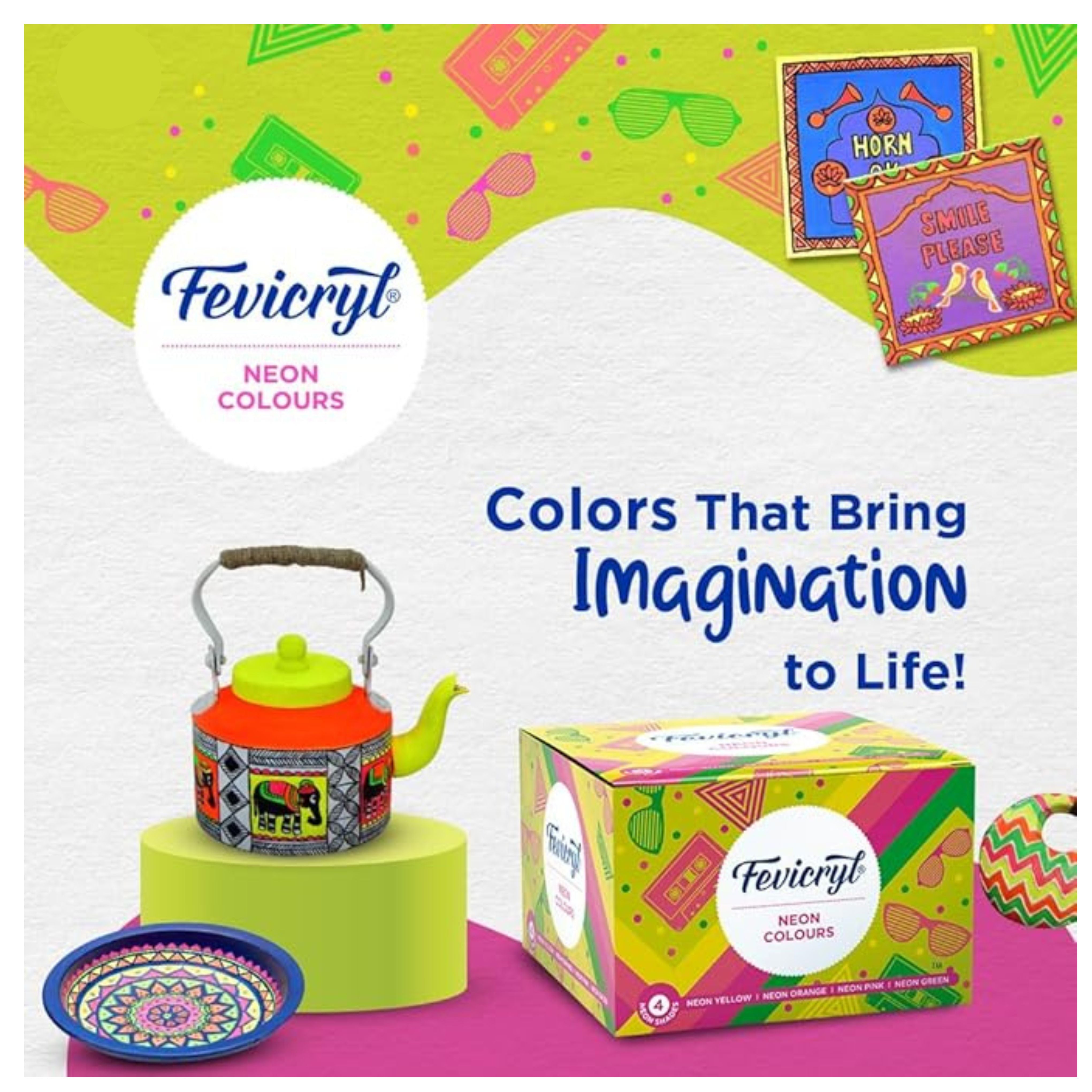 Bright and bold Fevicryl Neon Acrylic Colours perfect for multi-surface painting, mixed media art, and creative DIY projects.