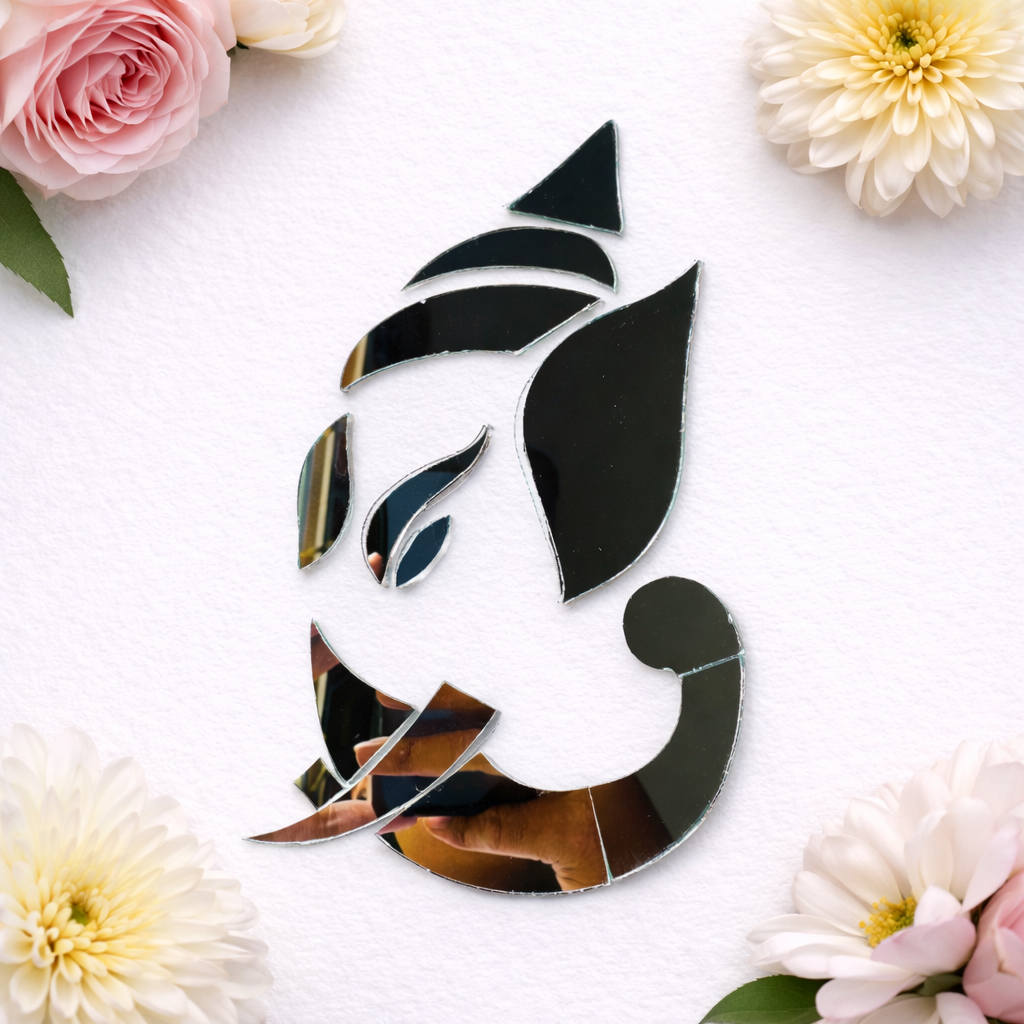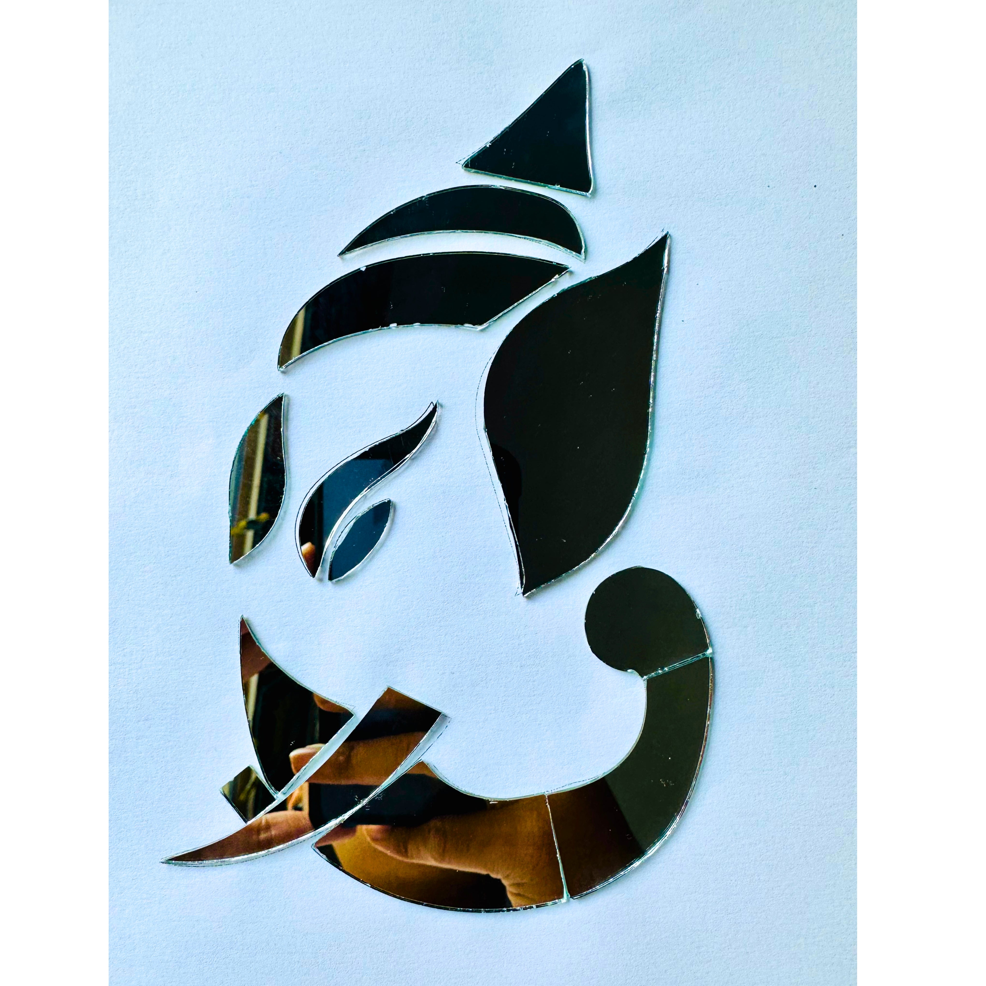 Beautiful Lord Ganesha–shaped silver mirror pieces designed for spiritual Lippan art, festive décor, and traditional DIY craft projects.